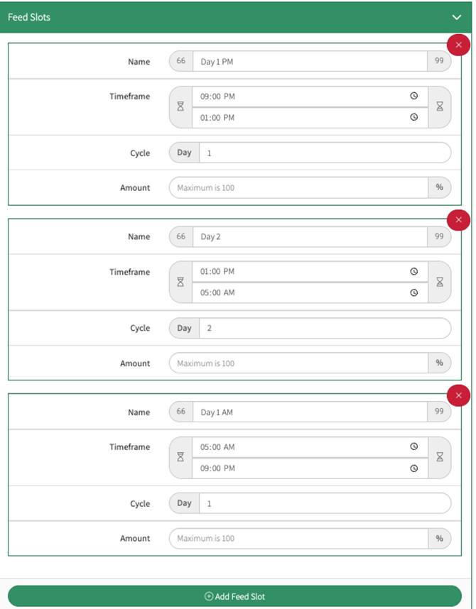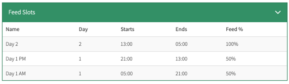 For the 16hr grazing, you will need 3 feed slots spread across 48 hours. The feed slot cycle day is allocated for the day that the feed slot starts on.