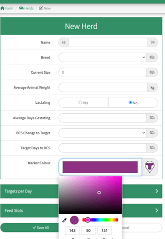 Marker Colour - Select the preferred colour and shade from the palette option which appears by clicking on the colour bar by the cow’s head. This is handy for identifying the herd on the maps