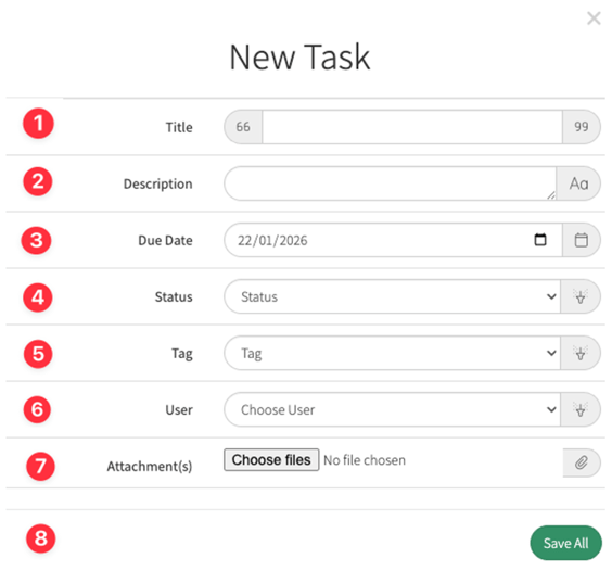 Title: Give the task a short and informative title. For example, "Fix the boundary fence", "Vehicle Maintenance", "Drench", etc.