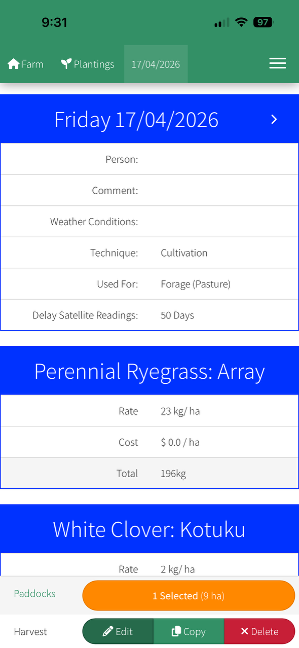 The next screen will show you a summary of the Planting that you just saved where you can Edit, Copy, Delete.