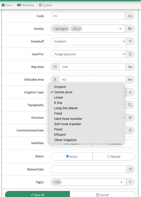 Assigning the correct Irrigation type to each paddock helps Pio calculate pasture growth more accurately.