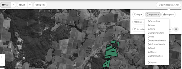Once irrigation settings are applied, you can filter your Feed Wedge and Reports by selecting Irrigation from the filter menu.