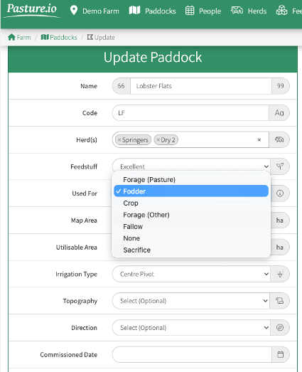 When you are ready to return the paddocks to the feeding rotation, follow the steps above and change the "Used For" option back to "Forage(Pasture)"