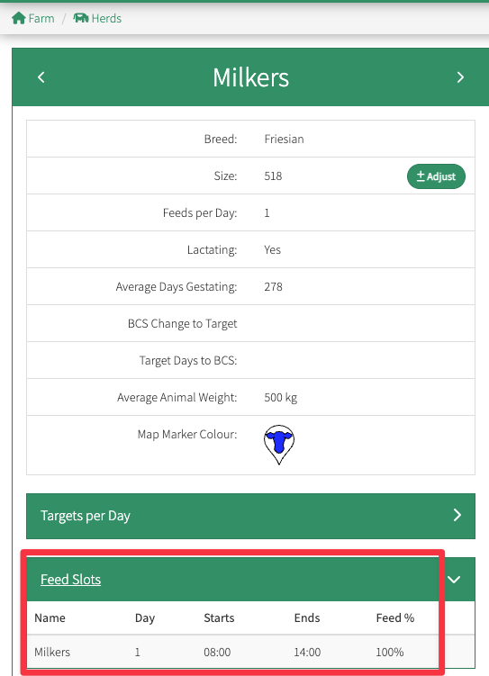 If cows are moving, waiting, or being shifted during the feed slot, grazing may be missed or assigned to the wrong paddock. To check feedslots are correct, go to Herds> “Herd Name” > “Feed Slots”.